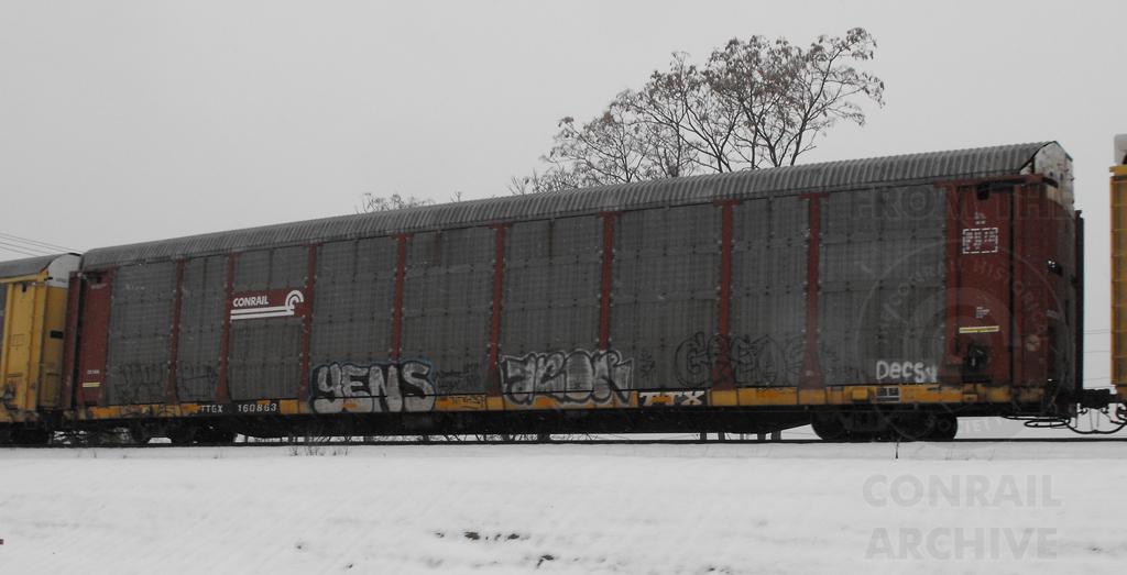 TTGX 160863 is seen in the consist of CSX Q216-13 at Newark, DE on 2/15/14. Rack number is CR 7496, built 1-89 and is now owned by NS.