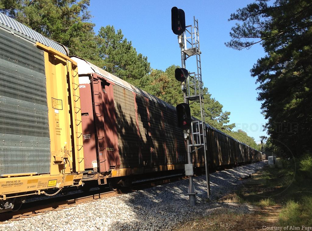 CSXT CW44AC 451 and C40-8W 7358 (CR 6193) pound a line of autoracks, including TTGX 160936, northbound past N.E. Aberdeen signal in Tyrone, GA on October 2, 2014.