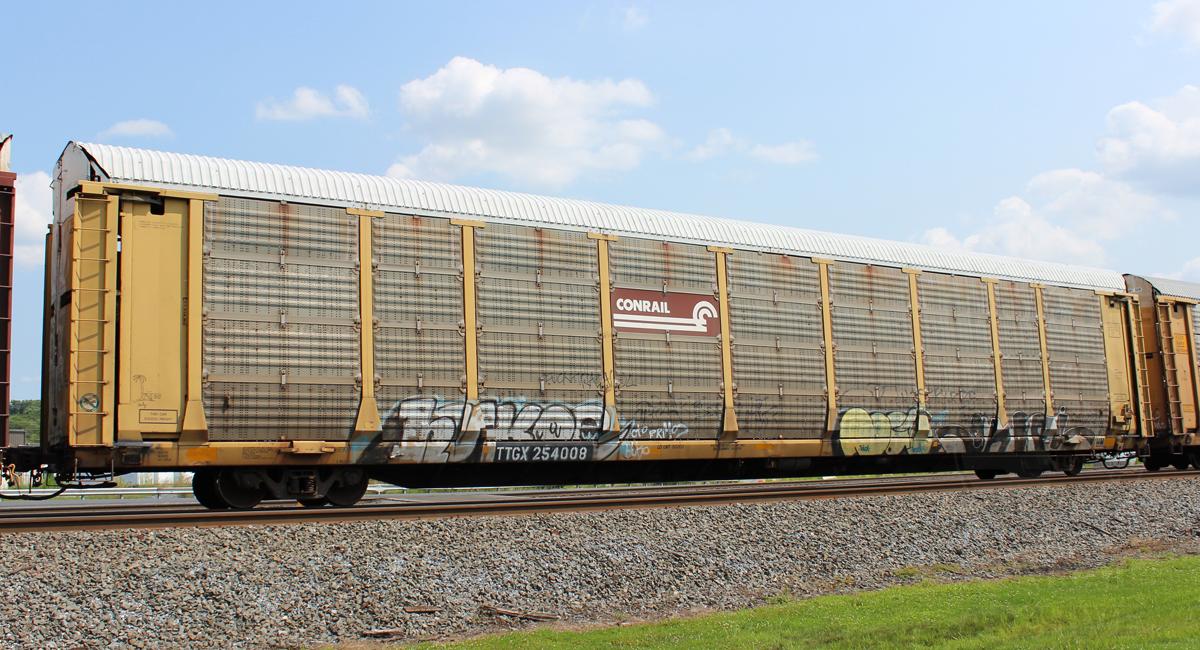 TTGX 254008 is seen in the consist of NS 11J at Harrisburg, PA on 8/9/14. Rack number is CR 7603, built 1-89, rebuilt 7-98 and is now owned by NS.
