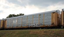 TTGX 255017 is seen in the consist of CSX M216-10 at Newark, DE on 6/13/23. Rackwas built as CR 1320, a CR ML2F class rack in 7-86. It was then rebuilt,repainted, and renumbered to CSX B-1320 in 5-21 by MEI ESTL.