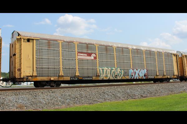 TTGX 255822 is seen in CSX paint on Q216-03 at Elsmere DE on 6/5/12. Rack number is still CR 1550, blt 12-85 and rebuilt and repainted CSX 1-06. Rack was classed as a ML2D on CR.
