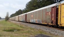 CSXT CW60AC 659 and SD40-2 8042 lead ETTX 701467 (CR ML3N rack 7411) and a line of autoracks, including TTGX 603758, southbound at Peachtree City, GA on April 3, 2014.