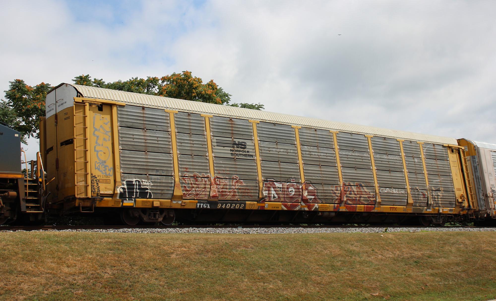 TTGX 940202is seen in the consist of CSX Q217-08at Newark, DE on 8/8/21. Rack was built as a unknown CR ML2M class rack in 3-91. It was then rebuilt, repainted and renumbered to NS 27067 in 6-05.