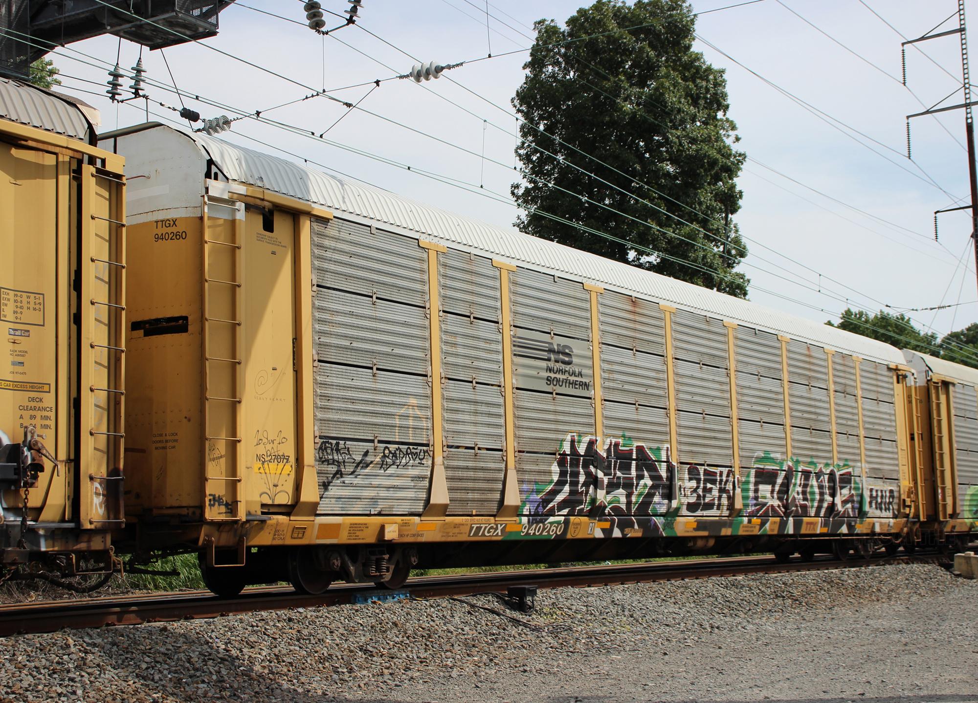 TTGX 940260is seen in the consist of NS 36A at Newport, DE on 8/7/21. Rack was built as a unknown ML2M class rack in 3-91. It then was rebuilt and repainted NS in 7-05. Rack is now classed FB549but is also stenciled ML2M.