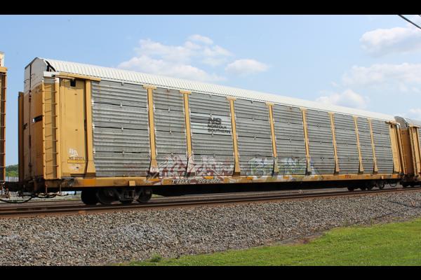 TTGX 940519 is seen in the consist of CSX Q217-16 at Elsmere, DE on 8/16/21. Rack was built as a unknown CR ML2M class rack in 4-91. It was then rebuilt, repainted and renumbered to NS 27091 in 7-05. Rack is now classed FB549 by NS.