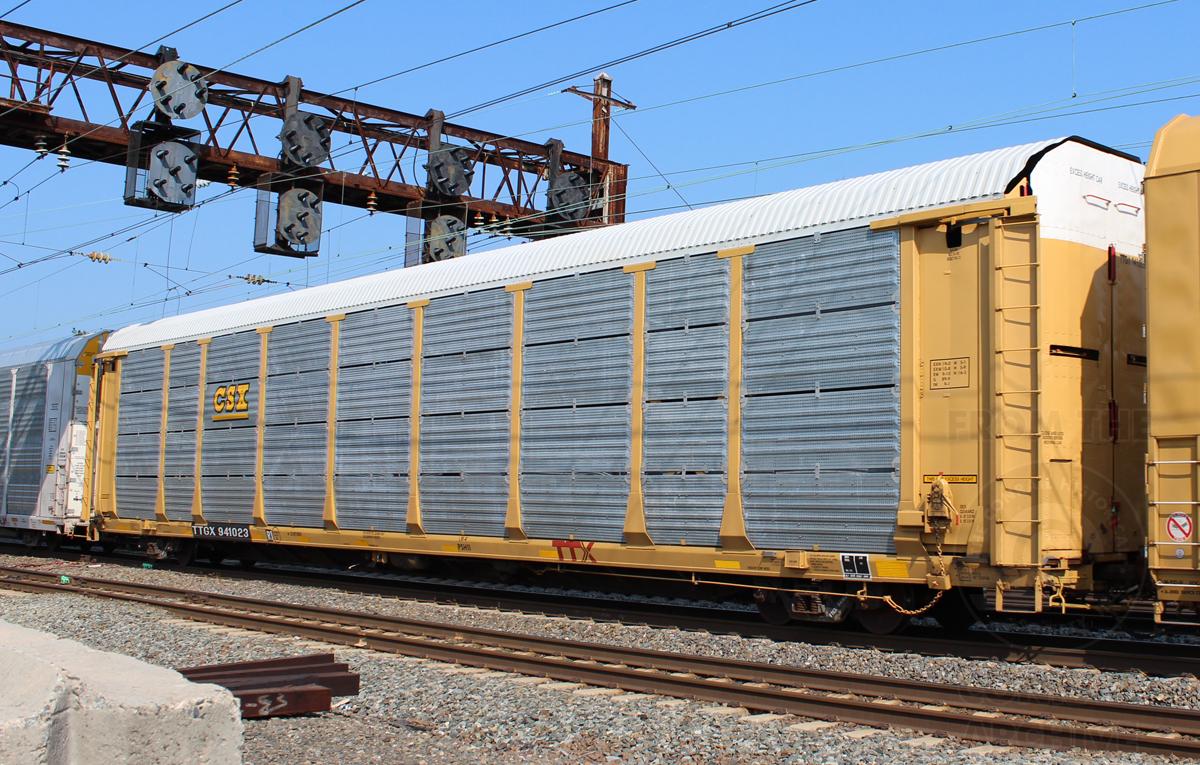 TTGX 941023 is seen in CSX paint in the consist of NS 36A at Newark, DE on 7/31/14. Rack was built as CR 9184, a ML2L class rack, in 1-92 and then rebuilt, repainted and renumbered to CSX B-9184 in 5-13.