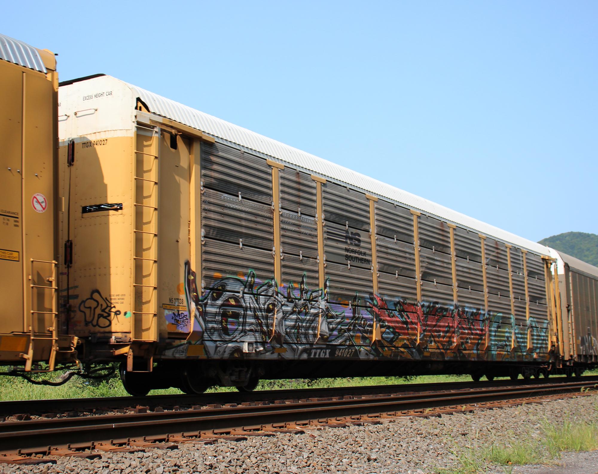 TTGX 941027 is seen in the consist of NS 11N at Marysville, PA on 7/27/24. Rack was built as an unknownML2L class rack in 1-92. It then was rebuilt, repainted and renumbered to NS 27138 in 4-05. Rack is now classed FB550 by NS.