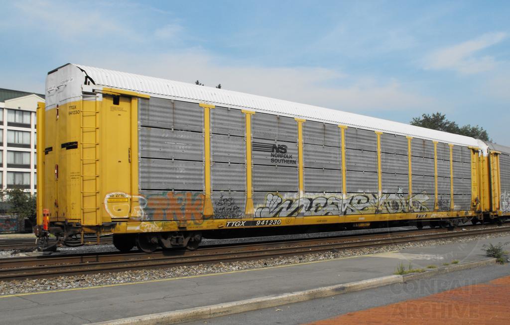 TTGX 941230 is seen in NS paint on Q261-08 at Cumberland MD on 8/9/12. Rack was built as a unknown ML2L class rack in 1-92 and was rebuilt, repainted, and renumbered to NS 27163 in 7-05. Rack now carries NS rack class of FB550.