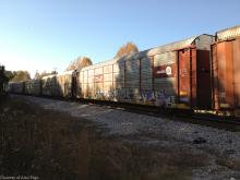 CSXT C40-9W 7721 and UP SD70M 5118 roll a line of autoracks, including TTGX 942175 (Thrall-built CR 9358 ML2L rack), northbound through Tyrone, GA at mile 835 on November 14, 2014.