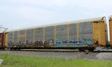TTGX 962284 is seen in the consist of CSX Q217-16 at Hancock, WV on 6/16/17. Rack number is CR 9429, built 2-93 then was rebuilt and repainted CSX 2-08.