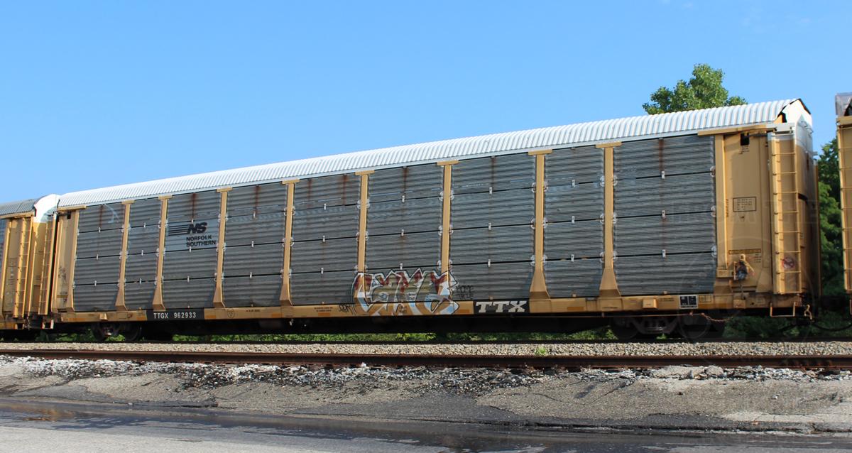 TTGX 962933 is seen in NS paint the consist of CSX Q217-11 at Elsmere, DE on 7/22/14. Rack was built as CR 8025, a CR ML2L class rack, in 4-90. It was then rebuilt, repainted, and renumbered to NS 27340 in 3-06. Rack is now classed FB548 by NS.