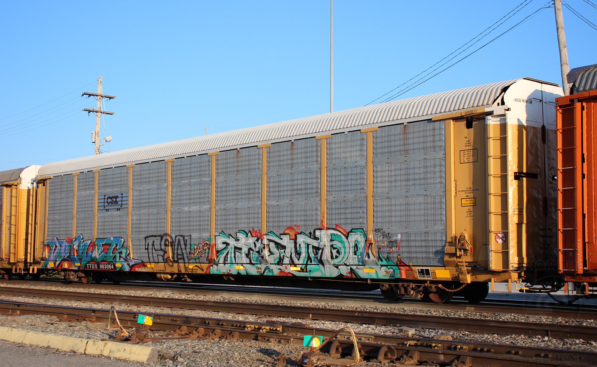 TTGX 963064 is seen in the consist of CSX X216-18 at Elsmere, DE on 8/18/23. Rack was built as CR 8134, a CR ML2L class rack, in 6-90/ It then was rebuilt, repainted and renumbered to CSX B-8134in 9-20 by MEI ESTL.