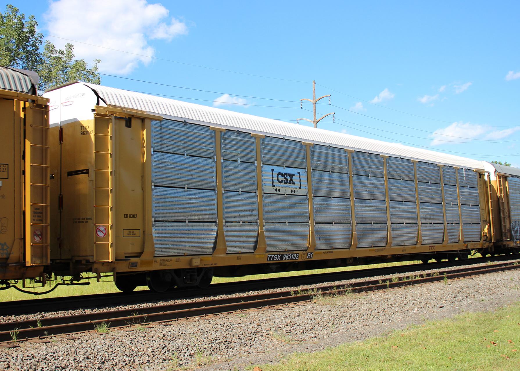 TTGX 963102 is seen in the consist of WB NS 34A at Wyomissing, PA on 9/5/20. Rack number is CR 8302 and was built 5-90. It was rebuilt and repainted CSX in 8-19.