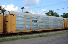 TTGX 963633 is seen in the consist of CSX Q217-08 at North Branch, MD on 7/8/20. Rack was built as CR 7532, a CR ML2K class rack, in 1-89. It was then rebuilt, repainted and renumbered to NS 29839 in 6-19 by TrinityRail as part of Job C1009. Rack does not have a new NS class stenciled on it. Photo by Chris Carangi.