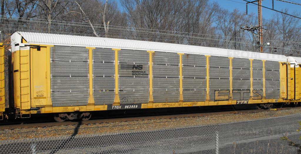 TTGX 963959 is seen in NS paint in NS 36A at Newport, DE on 12/18/13. Rack was built as a unknown CR ML2G class rack in 6-87 and was rebuilt, repainted and renumbered to NS 26429 in 1-05.