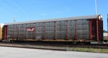 TTGX 964565 is seen in the consist of CSX Q296-17 at Elsmere, DE on 8/20/16. Rack number is CR 9160, built 1-92 and is now owned by NS. Note the odd placement of the TTX logo toward the center of the flat.
