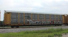 TTGX 964737 is seen in the consist of CSX Q277-13 at Hancock, WV on 6/14/17. Rack was built as CR 8036, a CR ML2L class rack, in 4-90 then was rebuilt, repainted and renumbered to NS 27346 in 12-07. Rack is now classed FB548 by NS.