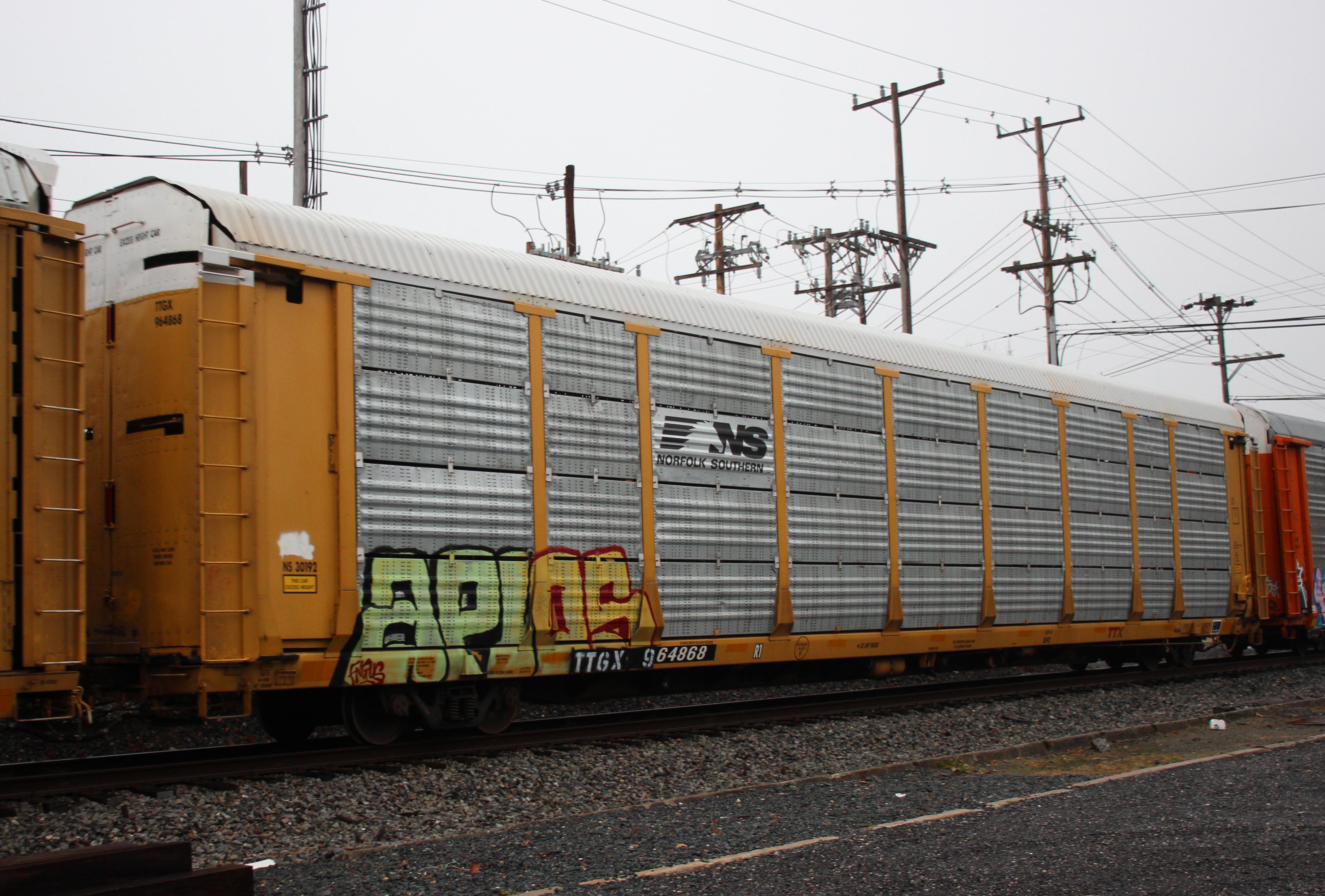 TTGX 964868 is seen in the consist of CSX M217-28 at Newark, DE on 12/28/24. Rack was built as CR 6716, a CR ML2G class rack, in 10-88. It was then rebuilt, repainted and renumbered to NS 30192 in 9-23 at MEI ESTL. Rack does not have a new NS rack class stenciled on it.