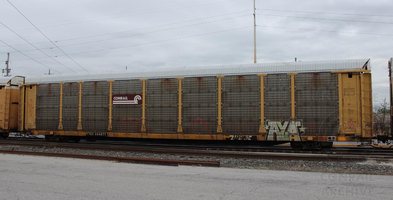 TTGX 964877 is seen in the consist of CSX L224-19 at Elsmere, DE on 5/20/17. Rack number is CR 8143, built 4-90, rebuilt 5-98 and is now owned by NS.