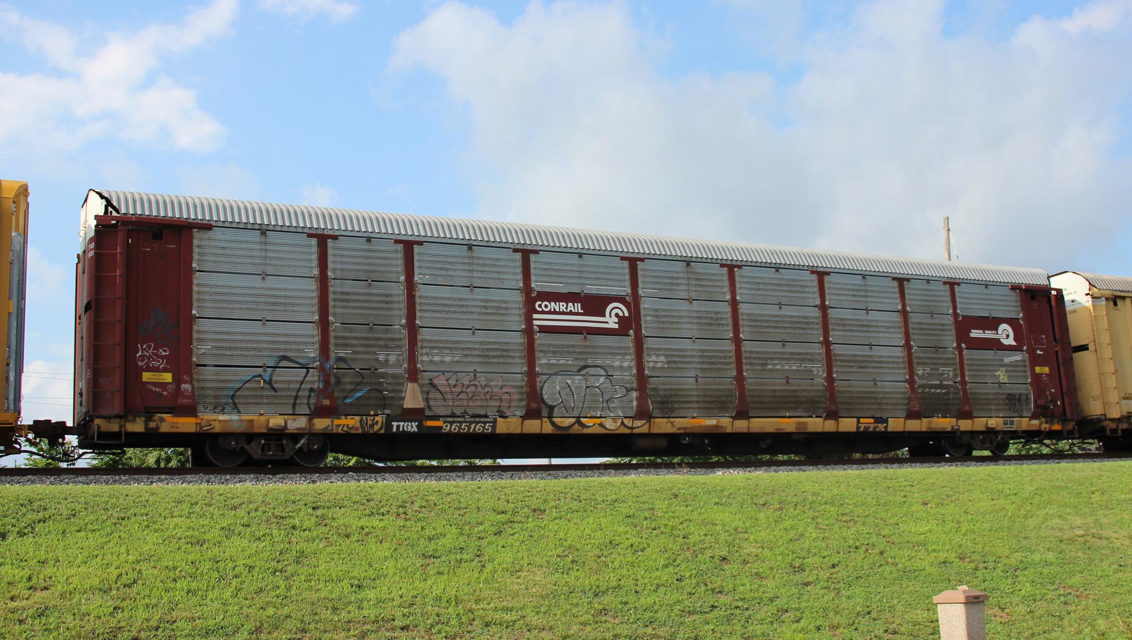 TTGX 965165 is seen in the consist of CSX Q216-06 at Newark, DE on 7/7/19. Rack number is CR 9445, built 2-93 and is now owned by CSX. Photo by Chris Carangi.