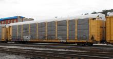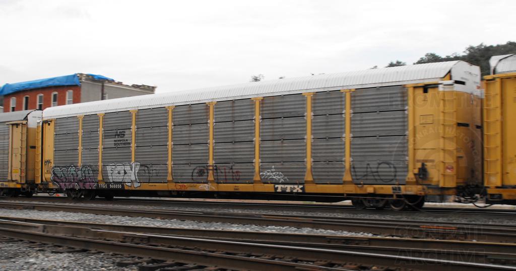 TTGX 966050 is seen in NS paint on Q216-08 at Cumberland MD on 8/9/12. Rack was built as CR 1449, a class ML2E rack in 5-86 and was rebuilt and repainted NS 10-03. Rack number is still CR 1449 and now carries NS rack class FB542.