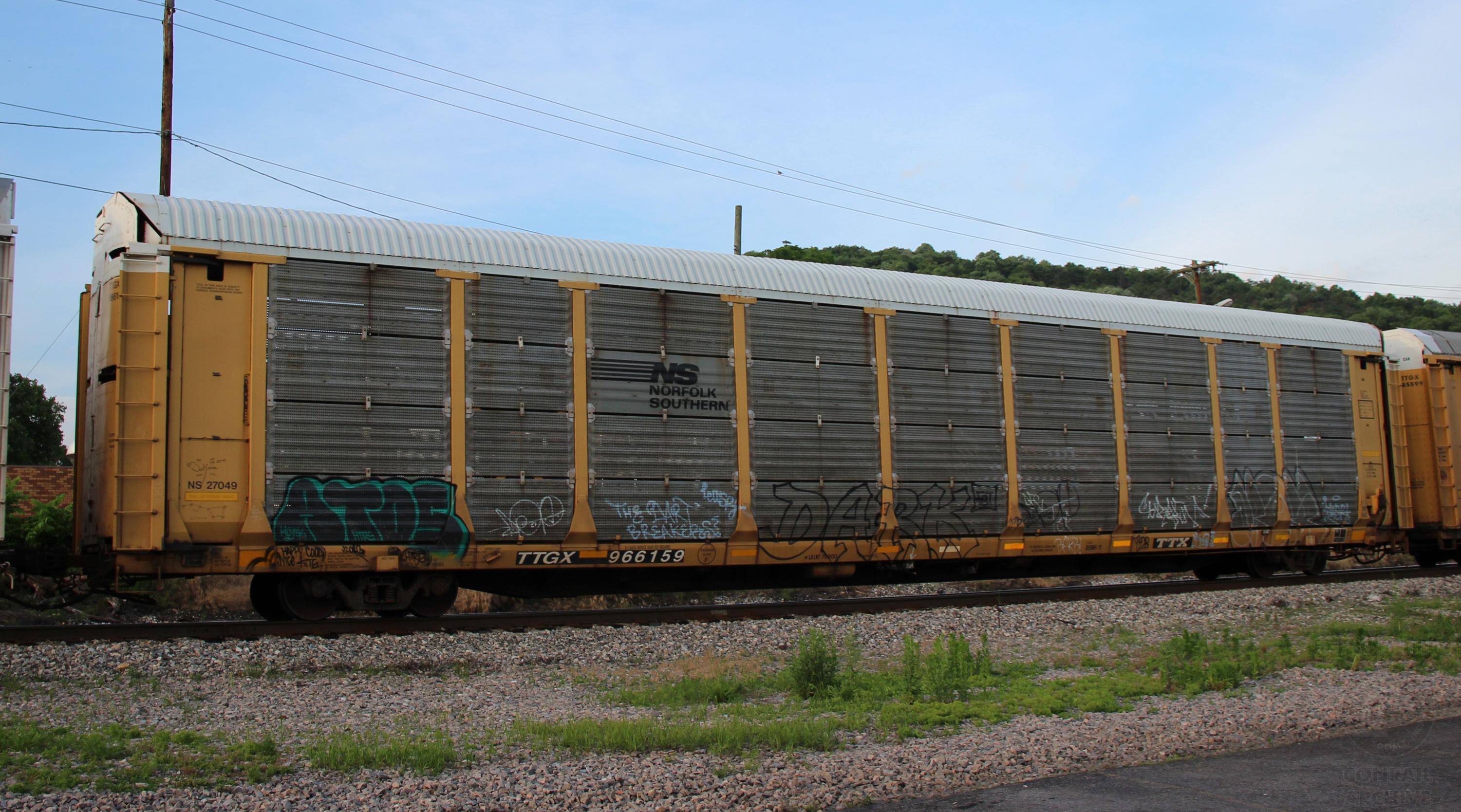 TTGX 966159 is seen in the consist of CSX Q217-13 at Cumberland, MD on 6/13/18. Rack was built as a unknown CR ML2E class rack in 5-86, then was rebuilt, repainted and renumbered to NS 27049 in 4-05. Rack is now classed FB542 by NS, but is also incorrectly stenciled ML2L.