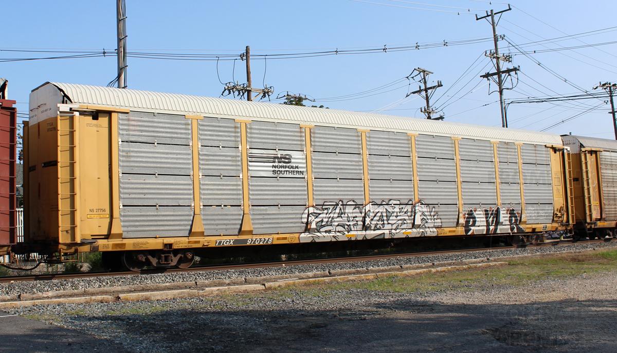TTGX 970278 is seen in NS paint in the consist of CSX Q217-22 at Newark, DE on 7/22/14. Rack was built as CR 9910, a CR ML2L class rack in 3-94 and then rebuilt, repainted and renumbered to NS 27756 in 12-08. Rack is now classed FB554 by NS.