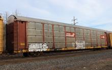 TTGX 971046 is seen in the consist of WB NS 34A at Wyomissing, PA on 12/23/16. Rack number is CR 10194, built 9-94 and is now owned by CSX.