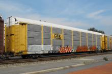 TTGX 1971973 is seen in CSX paint on Q261-08 at Cumberland MD on 8/9/12. Rack number is CR 10054 blt 3-94 and was rebuilt and repainted CSX 11-07.