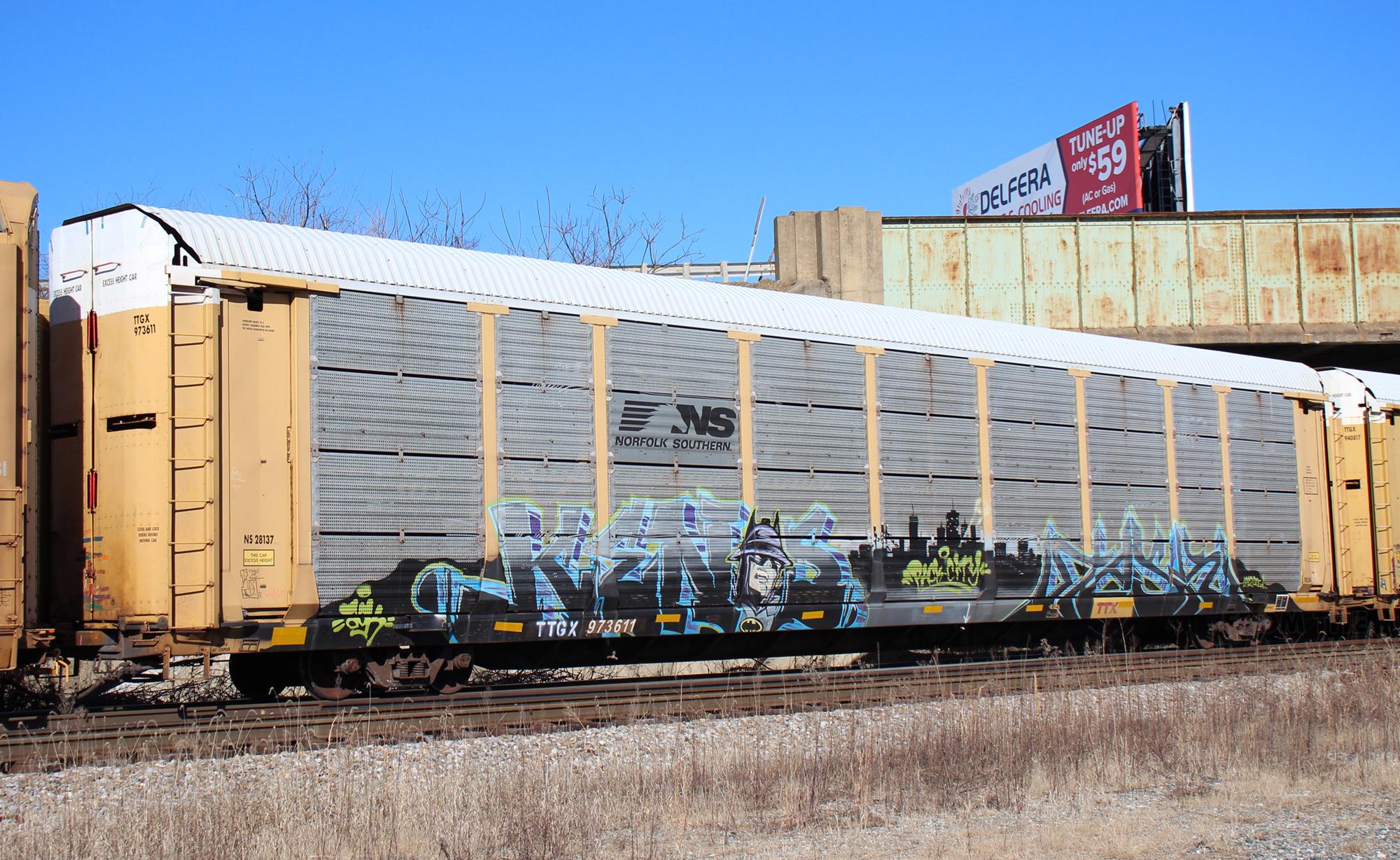 TTGX 973611 is seen in the consist of CSX M216-02 at Twin Oaks, PA on 2/4/24. Rack was built as CR 9842, a CR ML2L class rack, in 3-94. It was then rebuilt, repainted, and renumbered to NS 28137 in 4-14. Rack is now classed FB554 by NS.