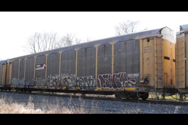 TTGX 974734 is seen in the consist of CSX Q217-27 at Newark, DE on 12/27/20. Rack number is CR 10110, built 3-94 and is now owned by NS.