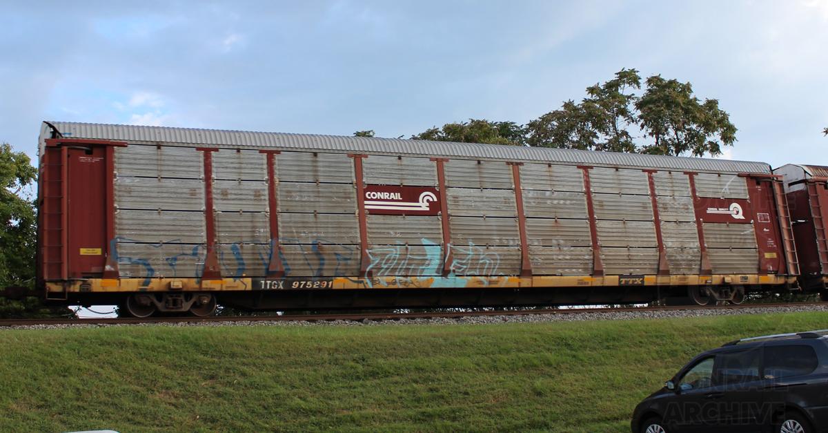 TTGX 975291 is seen in the consist of CSX Q217-09 at Newark, DE on 10/9/15. Rack number is CR 9829, built 10-93 and is now owned by NS.