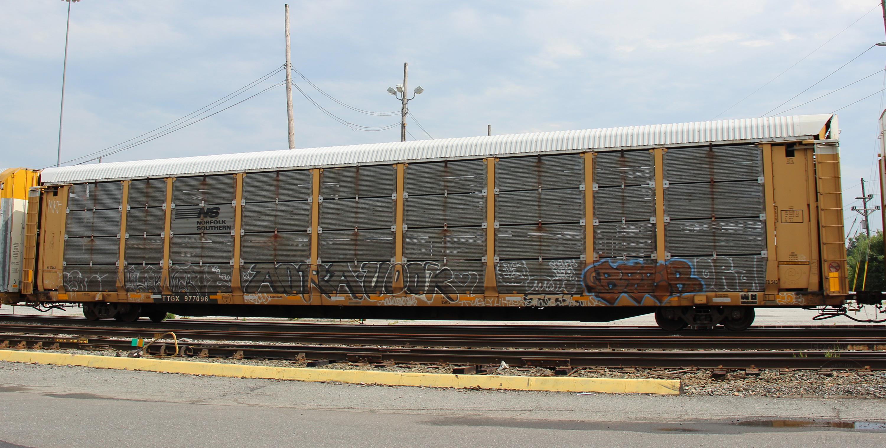 TTGX 977096 is seen in the consist of CSX Q216-13 at Elsmere, DE on 7/15/18. Rack was built as a unknown CR ML2F class rack in 7-86, then was rebuilt, repainted and renumbered to NS 27063 in 4-05. Rack is now classed FB543 by NS.