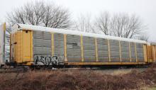 TTGX 977132 is seen in the consist of CSX Q216-27 at Newark, DE on 12/29/19. Rack was built as a unknown CR ML2M class rack in 4-91, then was rebuilt, repainted and renumbered to NS 27121 in 6-05. Rack is now classed FB549 by NS, but is also stenciled ML2M.