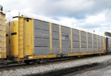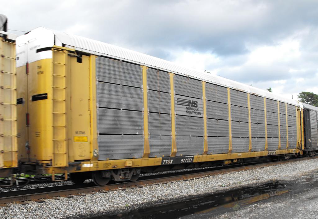 TTGX 977161 is seen in NS paint in CSX Q216-26 at Cumberland MD on 6/27/13. Rack was built as a unknown CR ML2F class rack in 4-86, then rebuilt, repainted and renumbered to NS 27065 in 8-05. Rack is now classed FB543 by NS.