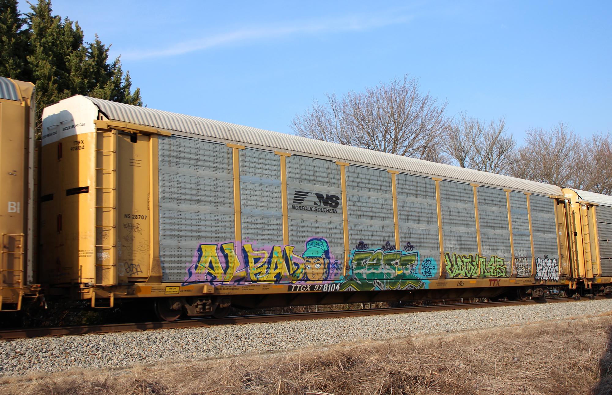 TTGX 978104is seen in the consist of CSX Q217-05at Newark, DE on 3/5/22. Rack was built as CR 10292, a CR ML2L class rack, in 12-94. It was then rebuilt, repainted and renumbered to NS 28707 in 12-18 by THCG. Rack does not have a new NS rack class stenciled on it.