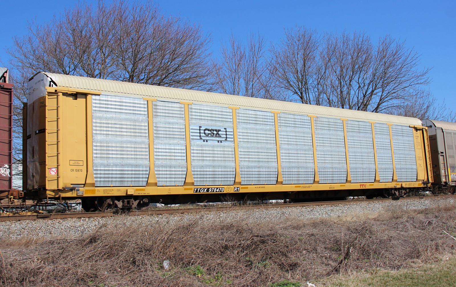 TTGX 978470 is seen in the consist of CSX Q216-06 at Newark, DE on 3/8/20. Rack was built as CR 10870, built 1-97 and was rebuilt and repainted CSX in 4-18.