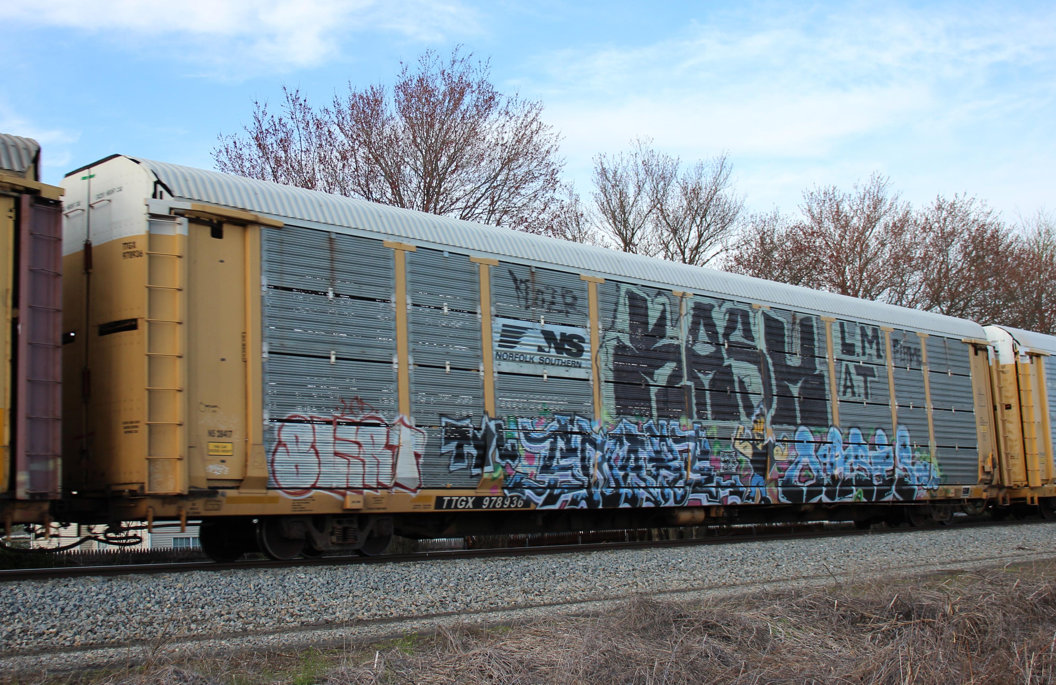 TTGX 978936 is seen in the consist of CSX Q217-03 at Newark, DE on 4/3/21. Rack was built as CR 9813, a CR ML2L class rack, in 10-93. It was thenrebuilt, repainted and renumbered to NS 28417 in 1-15. Rack is now classed FB553 by NS.