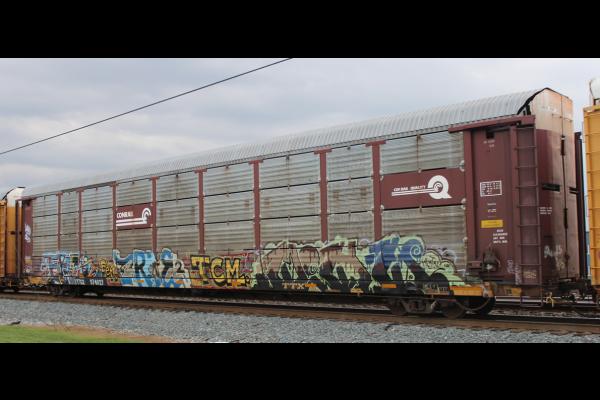 TTGX 980109 is seen in the consist of CSX M217-22 at Savage, MD on 4/22/23. Rack number is CR 10085, built 4-94, and is now owned by NS.