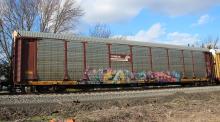 TTGX 980304 is seen in the consist of CSX Q216-14 at Newark, DE on 3/16/18. Rack number is CR 10882, built 9-97, and is now owned by NS.