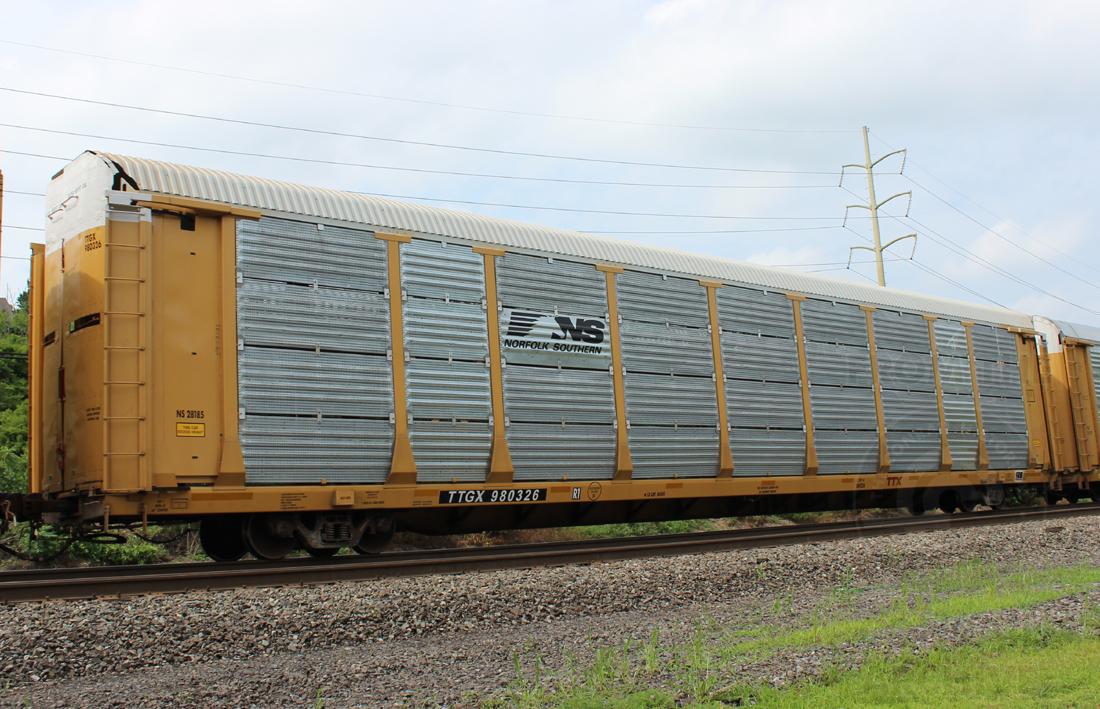 TTGX 980326 is seen in the consist of NS 11J at Wyomissing, PA on 7/9/15. Rack was built as CR 10039, a CR ML2L class rack, in 3-94 and was rebuilt, repainted and renumbered to NS 28185 in 3-15. Rack is now classed FB554 by NS.
