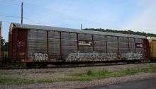 TTGX 980720 is seen in the consist of CSX Q217-13 at Cumberland, MD on 6/13/18. Rack number is CR 10000, built 3-94, and is now owned by NS.