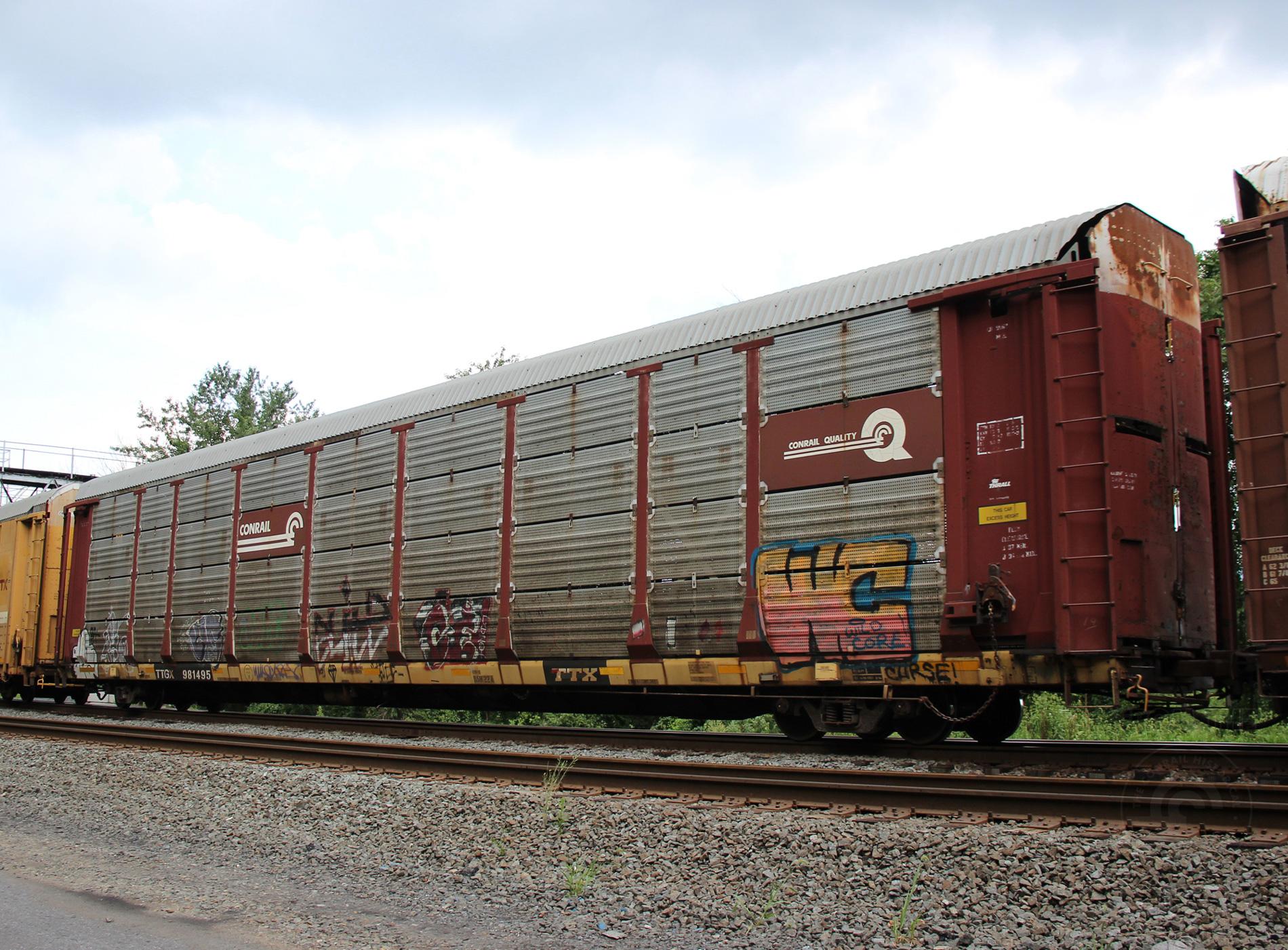 TTGX 981495 is seen in the consist of NS 35A at Marysville, PA on 8/17/19. Rack number is CR 9862, built 3-94 and is now owned by NS.