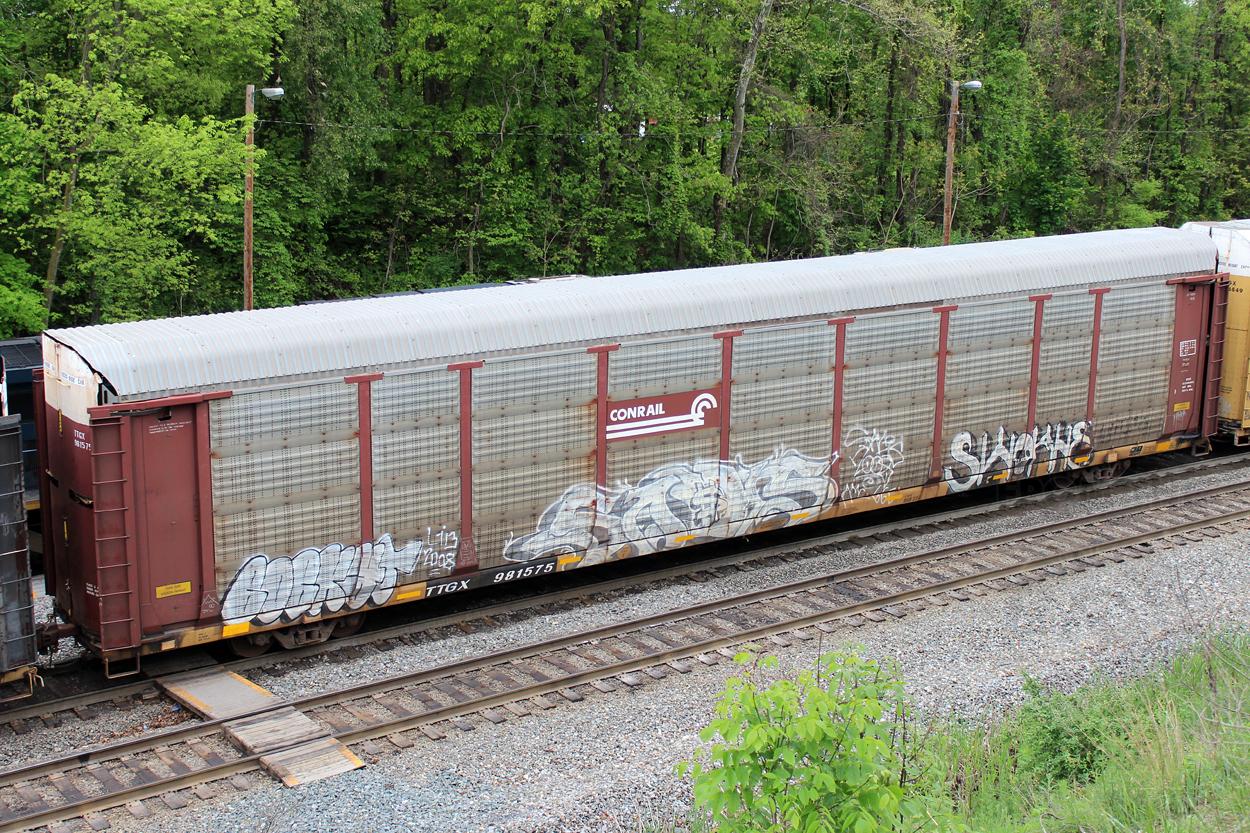Previous Next TTGX 981575 (class BSH-22A, rebuilt 9-97) with class ML2L rack CR 10904 (Thrall Job 97-0416). Photo By Donnie Lee Location Details Mexico Farms Equipment Type TTGX Bi-Levels Year 2016 Original Date 5/12/16 Collection CRHS Conrail Photo Archive Contributions