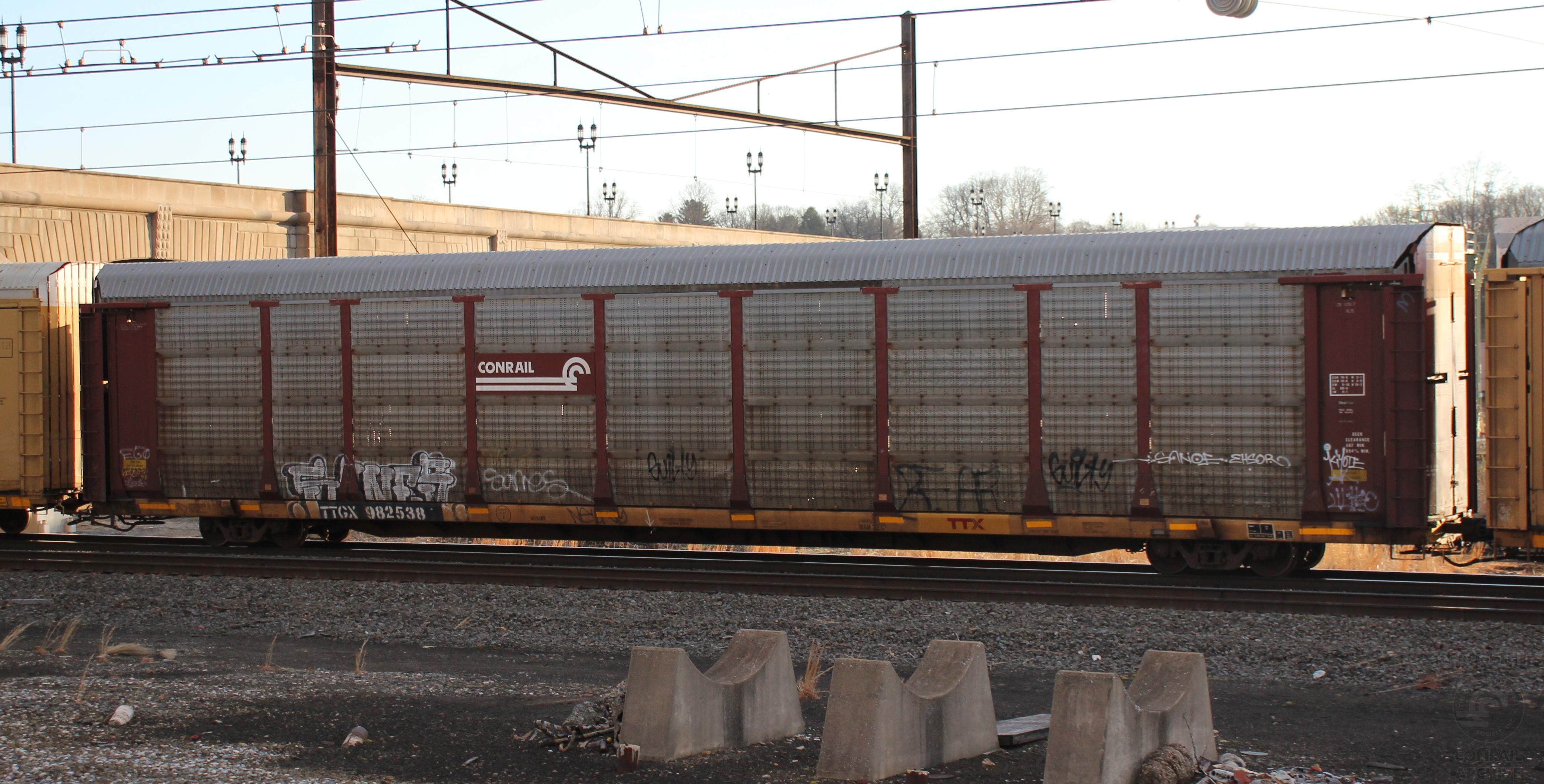 TTGX 982538is seen in the consist ofNS 18N at Harrisburg, PA on 3/26/22. Rack number is CR 10917, built 9-97 and is now owned by NS.