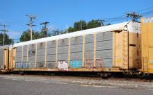 TTGX 983664is seen in the consist of CSX X816-13 at Newark, DE on 8/13/23. Rack was built as CR 9770, a ML2L class rack, in 10-93. It then was rebuilt, repainted and renumbered to NS 28233 in 8-14 by MEI ESTL. Rack is now classed as a FB553 by NS.
