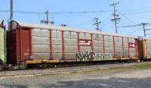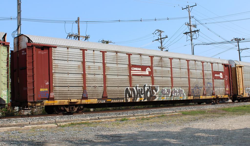 TTGX 990238 is seen in the consist of CSX Q217-08 at Newark, DE on 8/8/14. Rack number is CR 9804, built 10-93 and is now owned by NS.