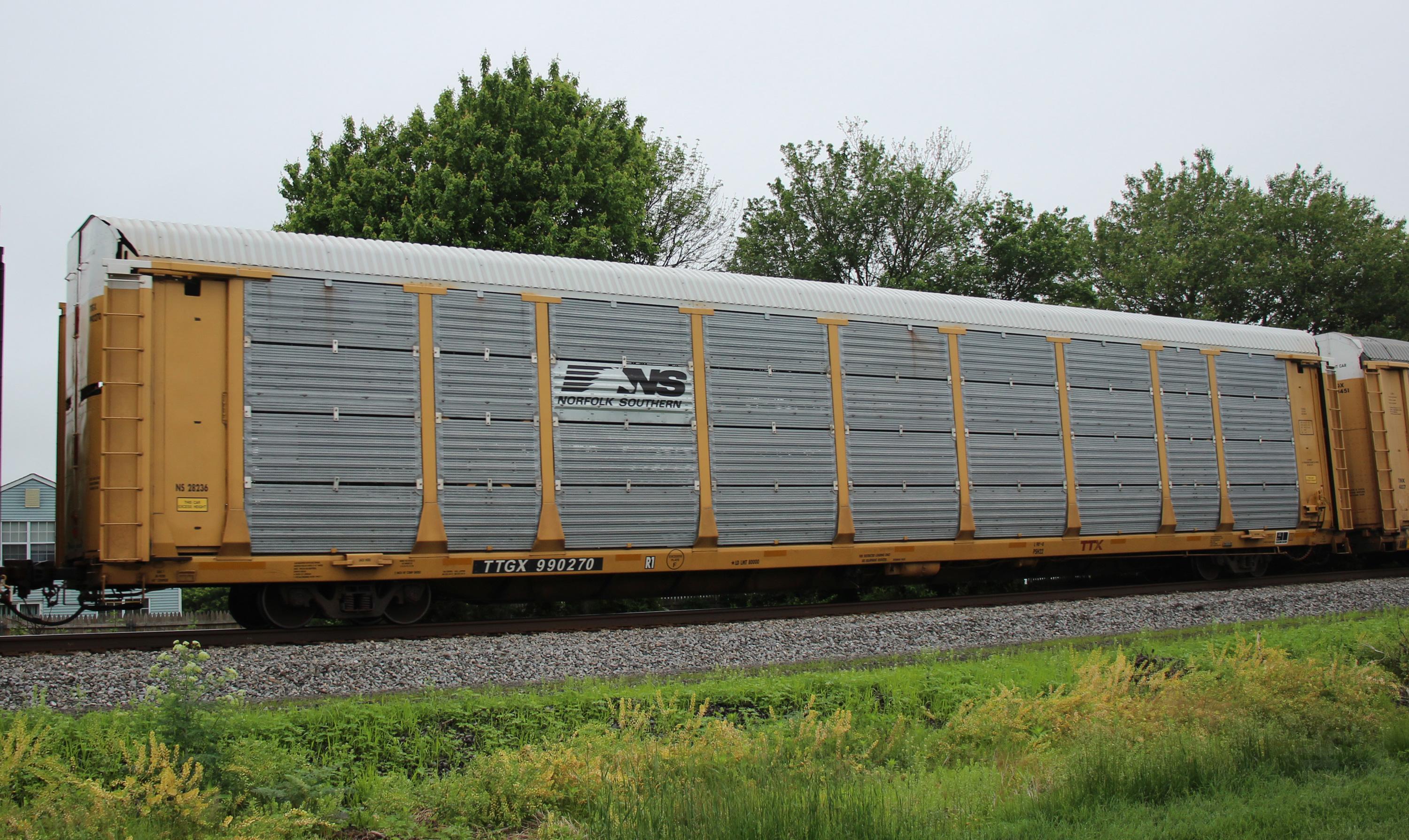 TTGX 990270is seen in the consist of CSX Q217-29 at Newark, DE on 5/29/18. Rack was built as CR 10028, a CR ML2L class rack, in 3-94 then was rebuilt, repainted and renumbered to NS 28236 in 8-15. Rack is now classed FB554 by NS. I have now photograghed this rack in both CR and NS paint.