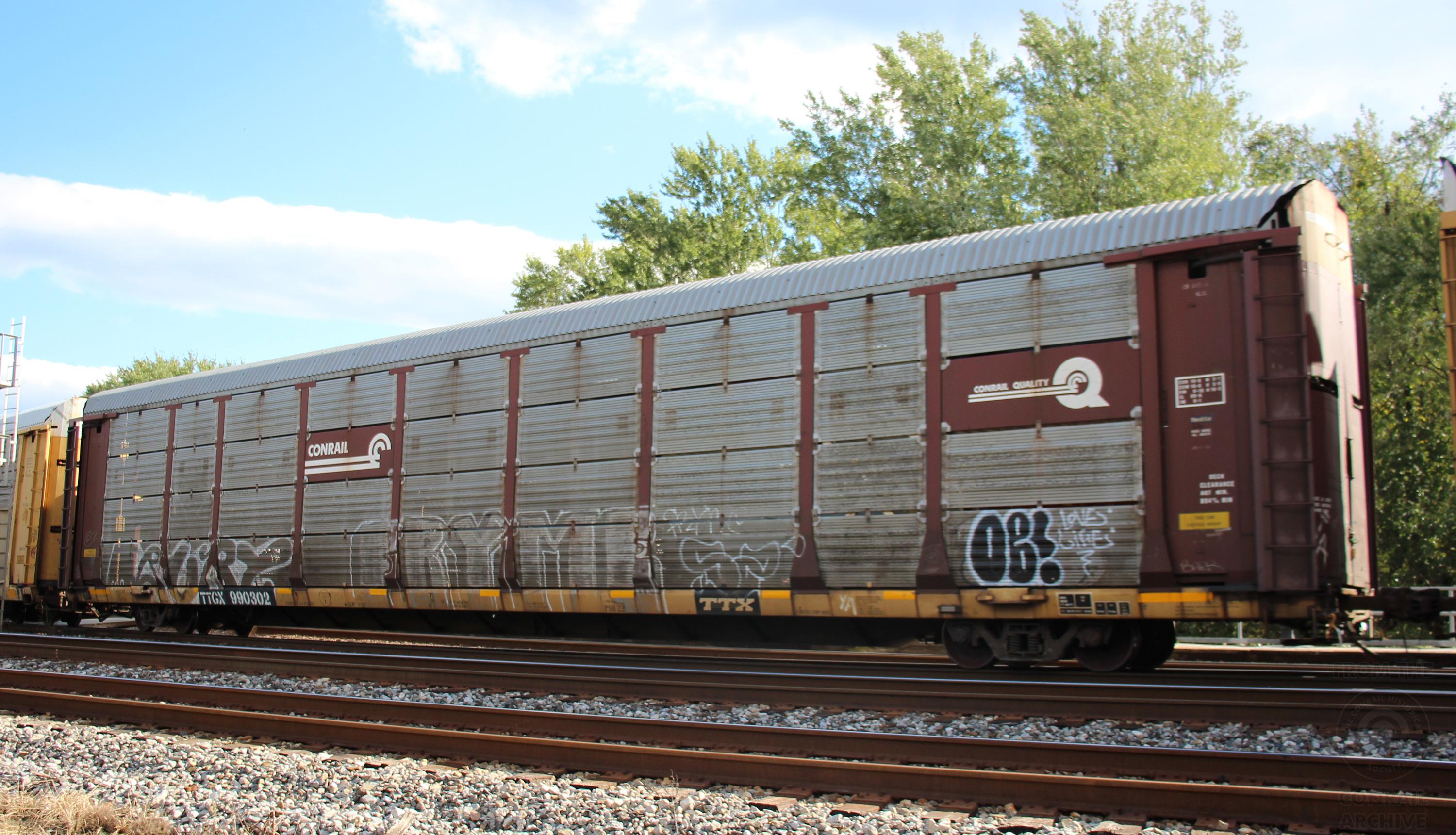 TTGX 990302 is seen in the consist of CSX Q216-18 at Point of Rocks, MD on 10/20/18. Rack number is CR 10311, built 12-94, and is now owned by NS.