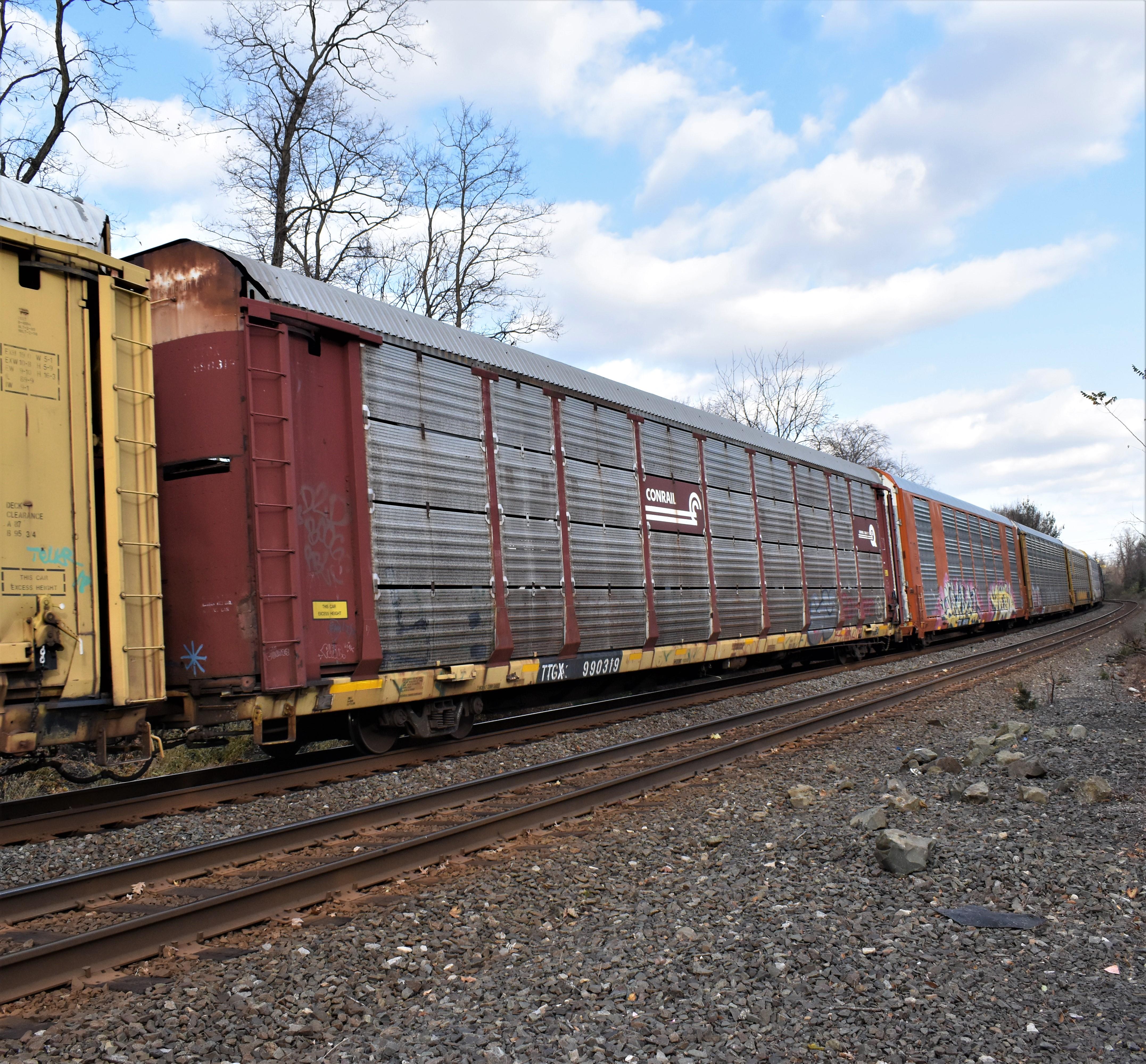 Conrail auto carrier. TTGX #990319. Eastbound on a Norfolk Southern freight on Main 1 at New Market Road, Piscataway, NJ on November 17, 2022